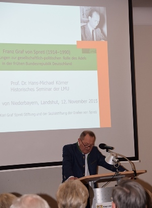 Am 12. November 2015 referierte Prof. Dr. Hans-Michael Körner in Landshut über die gesellschaftspolitische Rolle des Adels in der frühen Bundesrepublik Deutschland und exemplifizierte seine Überlegungen am Beispiel Franz Graf von Spretis, der nach dem Zweiten Weltkrieg zahlreiche kommunal-, aber auch gesellschaftspolitische Ämter innehatte: So z.B. das des Landrats von Landshut oder des Bezirkstagspräsidenten von Niederbayern.