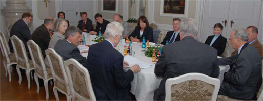 Diskussion der Gesprächteilnehmer. Am Tischende rechts: Herzog Franz von Bayern, eingerahmt von den beiden Initiatoren der Berchtesgadener Gespräche, Prof. Dr. Hans-Michael Körner (rechts von ihm) und Prof. Dr. Albert Scharf (links, mit dem Rücken zum Betrachter)
