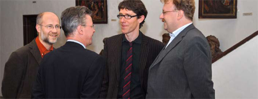 Gespräch in der gotischen Eingangshalle des Schlosses: Der Astrophysiker Prof. Dr. Harald Lesch, der Gräzist Prof. Dr. Martin Hose und die beiden Journalisten Prof. Dr. Hans-Joachim Neubauer (Rheinischer Merkur) und Jürgen Kaube (FAZ) (v.l.n.r.)